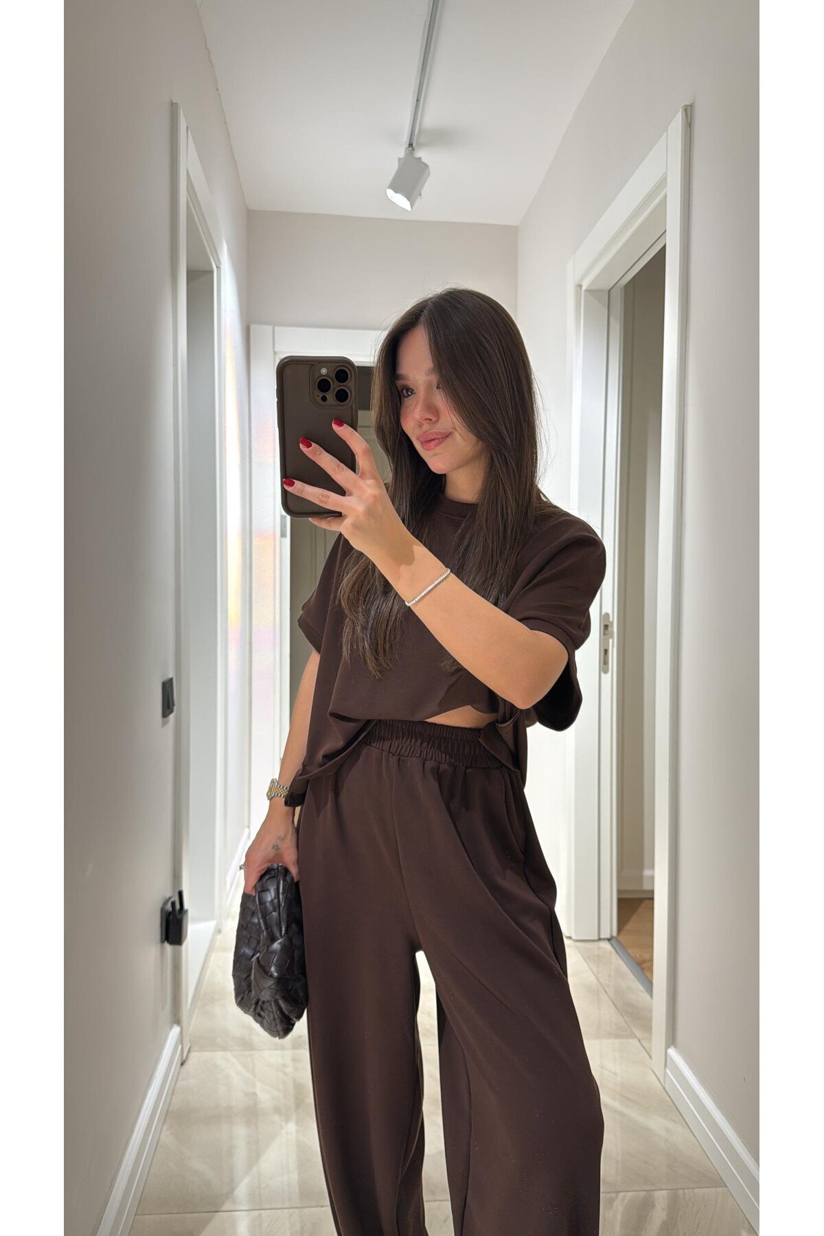 Kahverengi Bisiklet Yaka Modal Şalvar Pantolon Takım