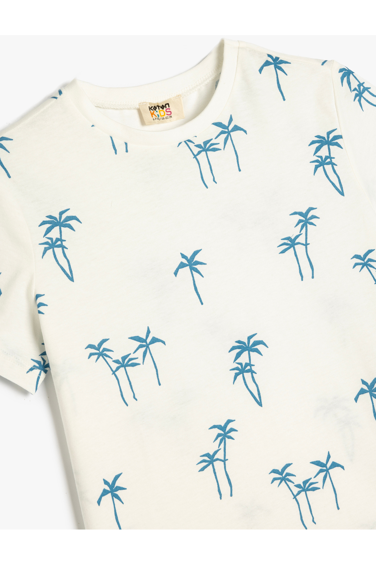 Tişört Kısa Kollu Palmiye Baskılı Bisiklet Yaka Dokulu Pamuklu