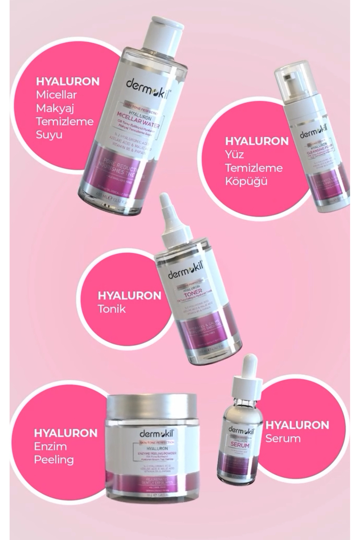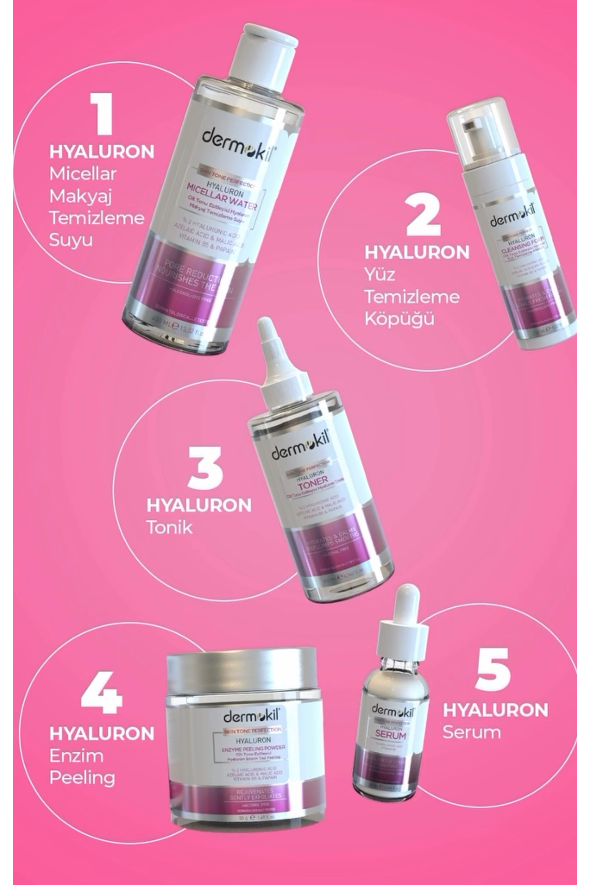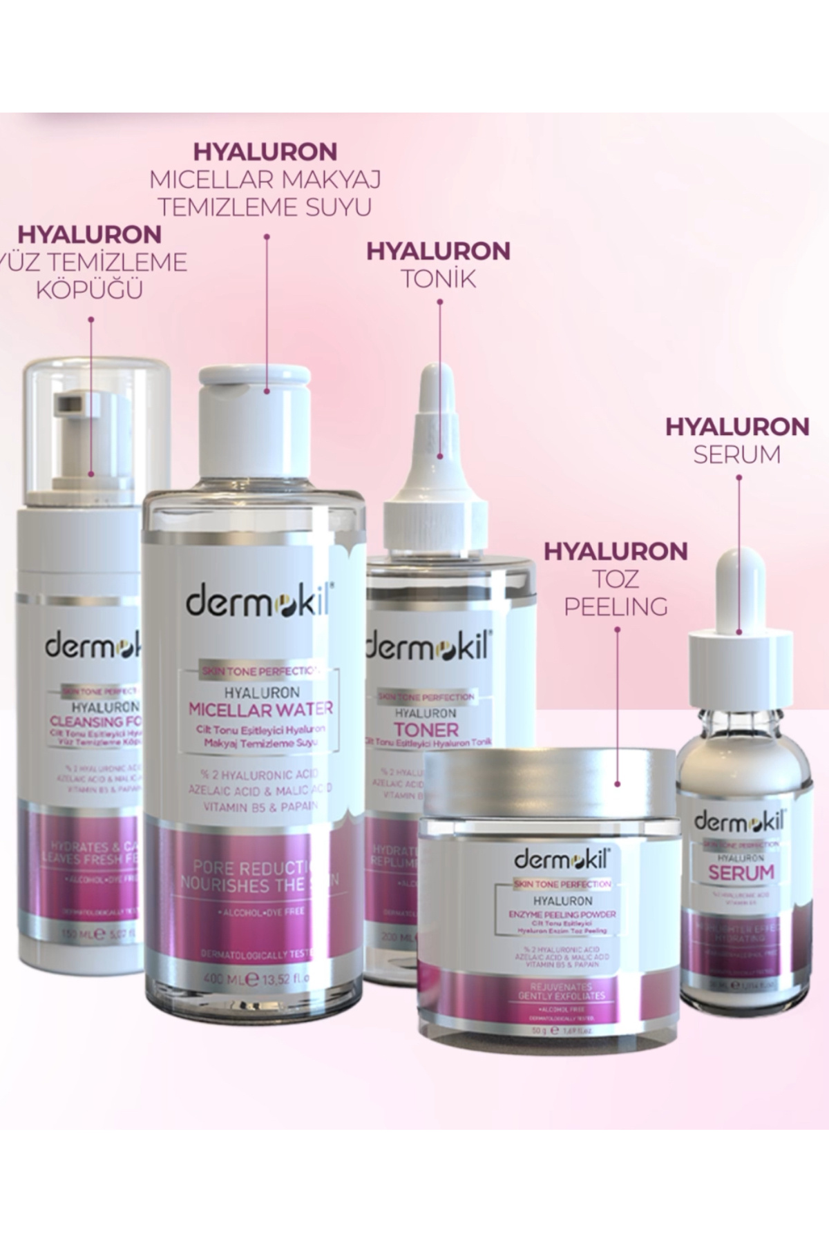 Ürün Açıklaması Dermokil cilt tonu eşitleyici hyaluron set içerdiği Papain, Azelaic ve Malic Asitler sayesinde ölü deri, yağ, kir ve makyaj kalıntılarından arındırılmasına, gözenek görünümünün azalmasına ve sebum salgısının dengelenmesine yardımcı olur.