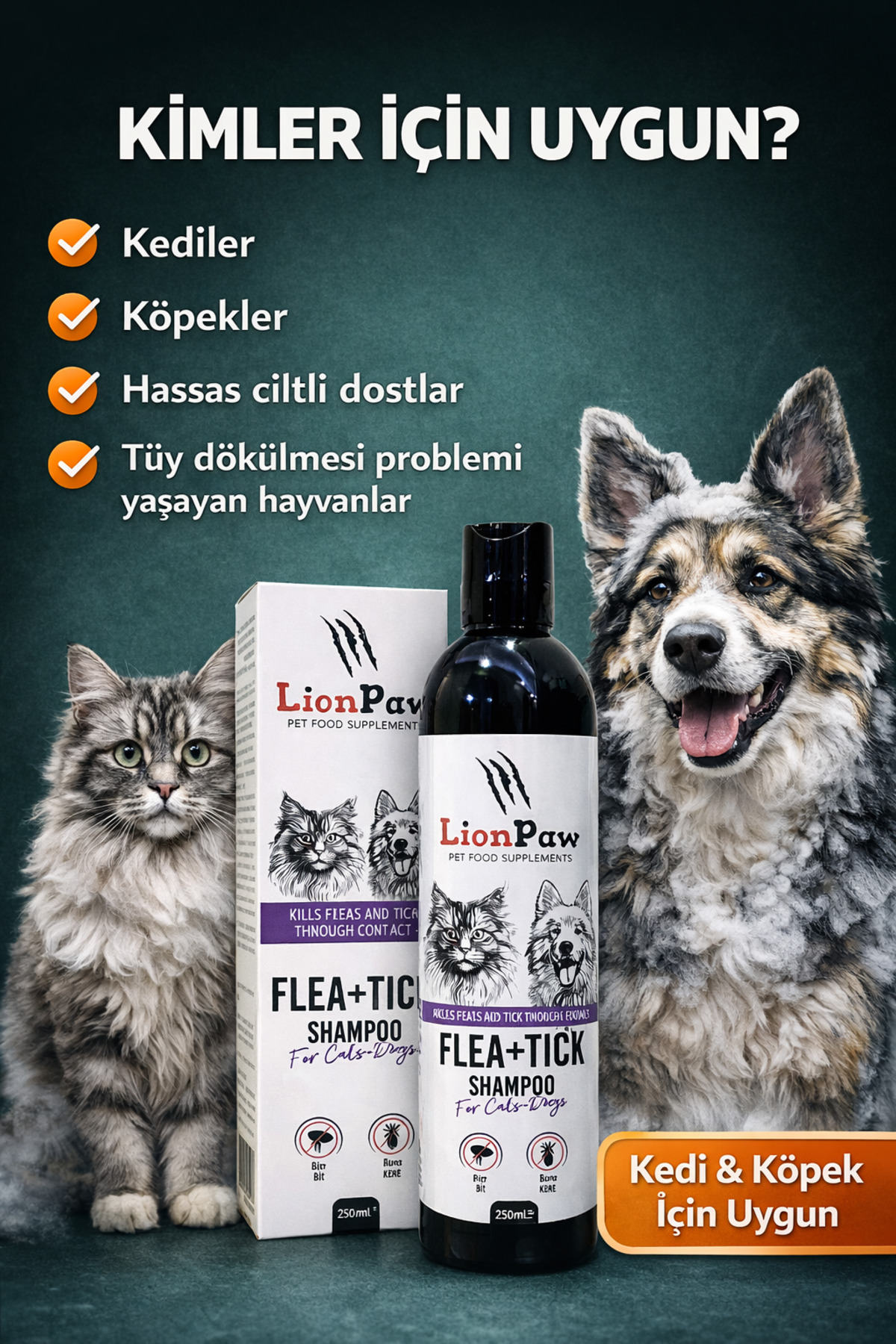 🌿 Ürün Özellikleri Kedi ve köpekler için uygundur Tüy dökülmesini azaltmaya yardımcı bakım Bit, pire ve kene gibi dış etkenlere karşı destekleyici temizlik Cildi kurutmadan nazik temizlik Tüyleri yumuşatır ve parlaklık kazandırır 250 ml ekonomik ambalaj 🐶🐱 Neden Lion Paw? Evcil hayvanlarda sık görülen tüy dökülmesi ve dış etkenlere maruz kalma sorunlarına karşı tek üründe pratik bakım sunar.