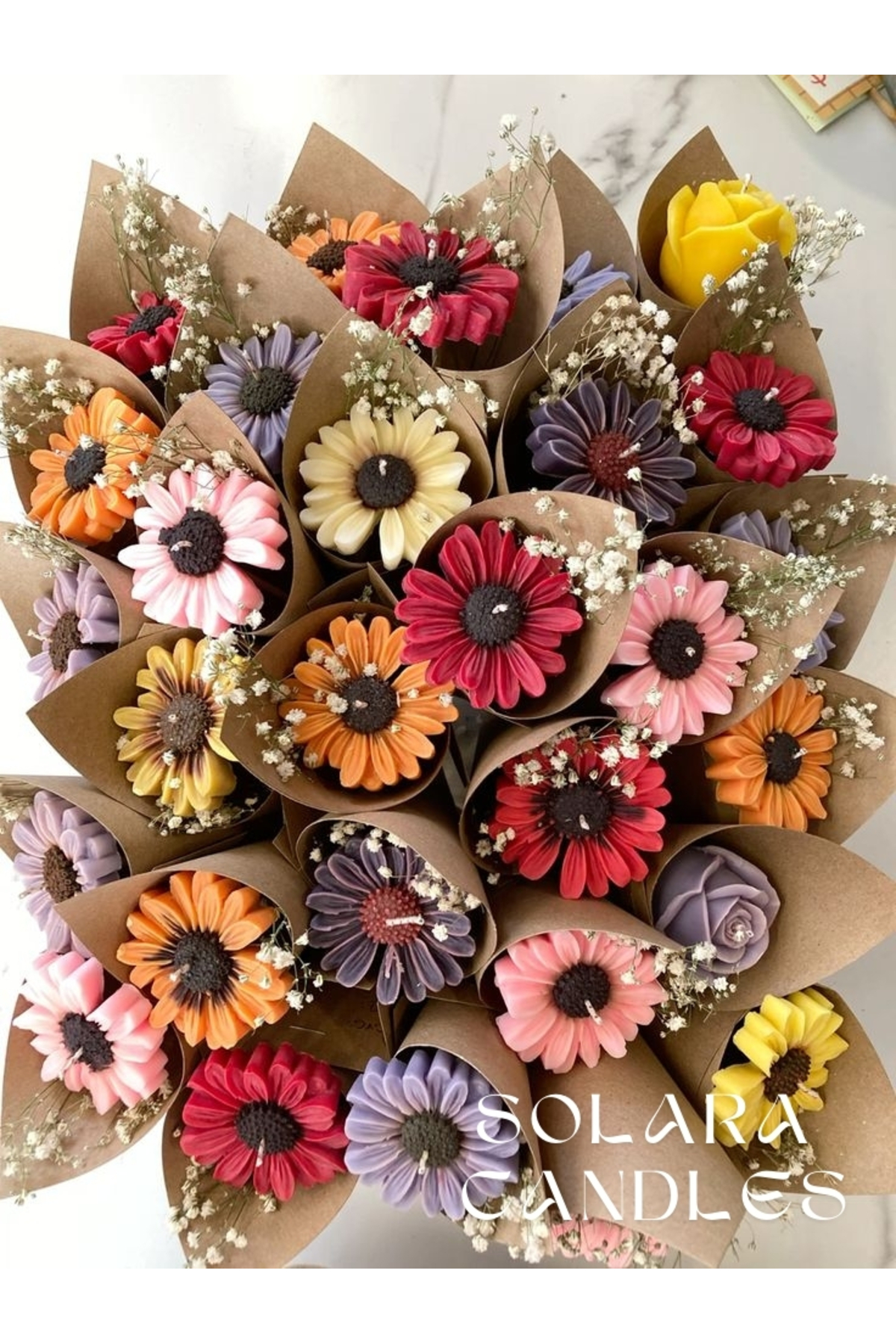 El yapımı çiçek formundaki bu özel mum buketi, hem görsel olarak büyüleyici hem de kokusuyla ortamınıza ferahlık katan eşsiz bir tasarım sunar.
