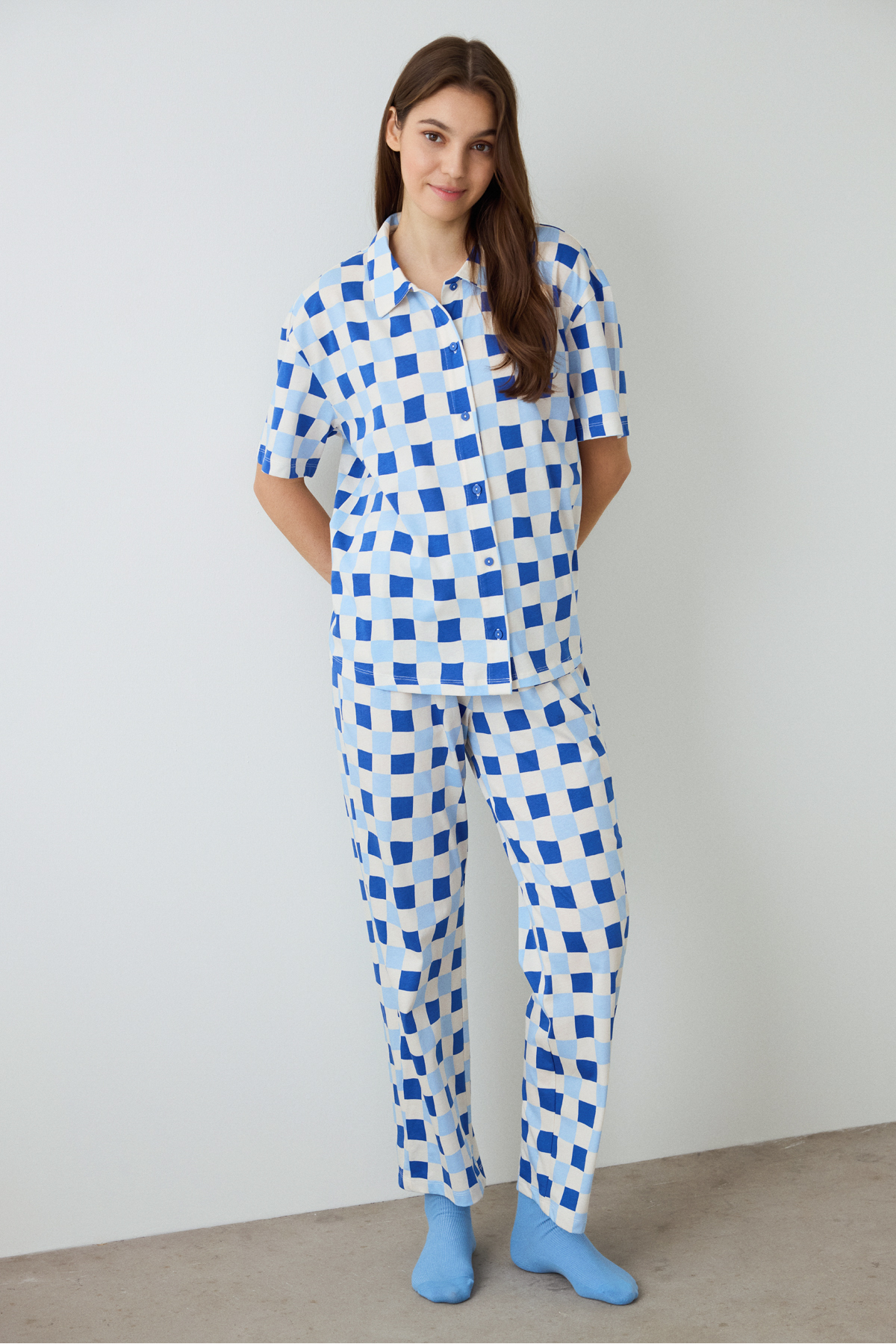 Ekoseli Rhea Gingham Gömlek Yaka Pamuklu Kısa Kollu Pijama Takımı