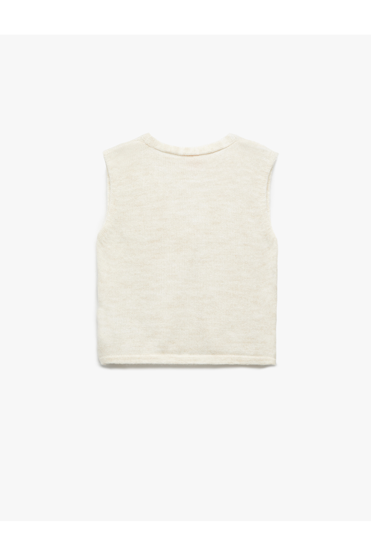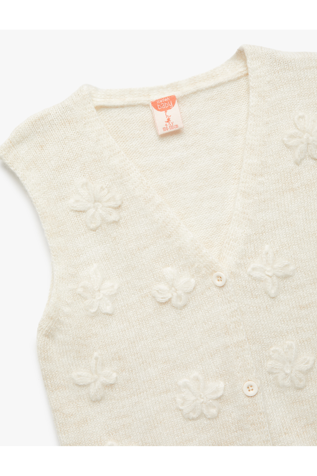 Çiçek Aplikeli Düğmeli V Yaka Triko Süveter
