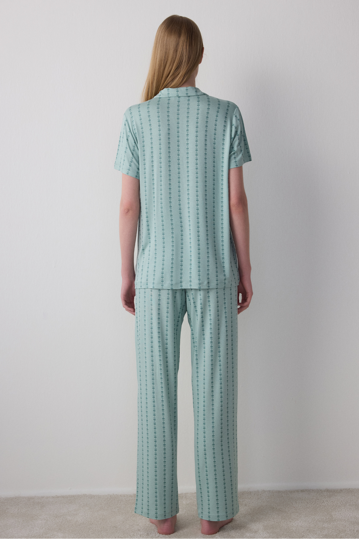 Mint Yeşili Lenna Çizgili Gömlek Yaka Pijama Takımı