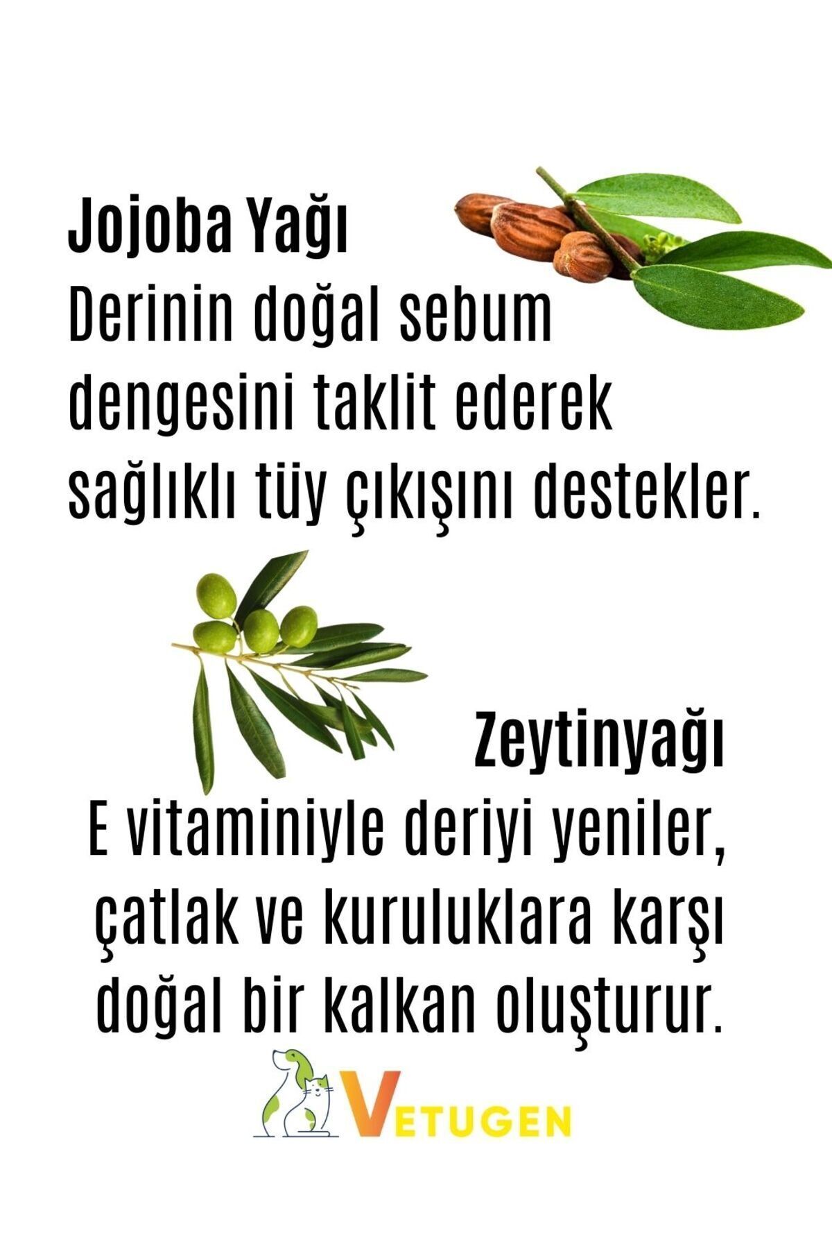 Kokusunu doğal ıtır yağından alan, parfüm, alkol, paraben, SLS, mineral yağ, toksik kimyasal içermeyen VETUGEN PRO SKIN & COAT TÜY, DERi, PATİ, BURUN ÖZEL BAKIM VE KITIK LOSYONU, kedi ve köpekler için özel olarak formüle edilmiş, özenle seçilmiş doğal yağlar içeren, 5 farklı etkiyi 1 üründe birleştiren bir üründür.