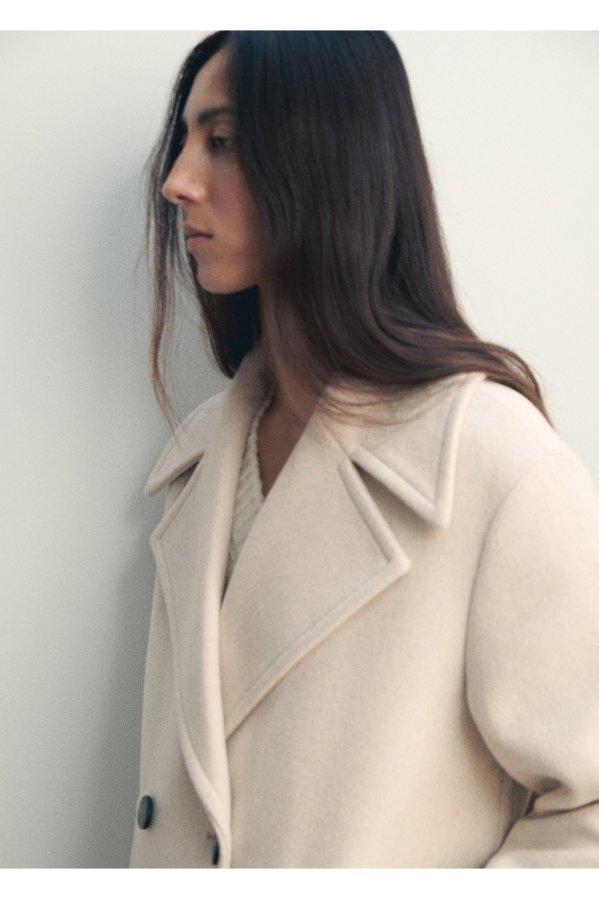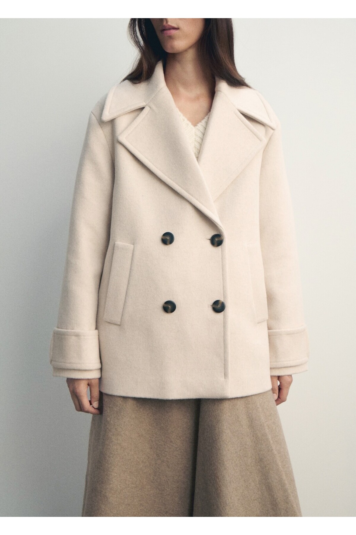 ürün, Karma yün kumaşlı, Çapraz tasarım, Düz tasarım, Solapa yaka, Çentikli solapalar, Uzun kollu, düğmeli şerit manşetli, İki yan cep, Çapraz düğmeli ön kapama, İç astar.
