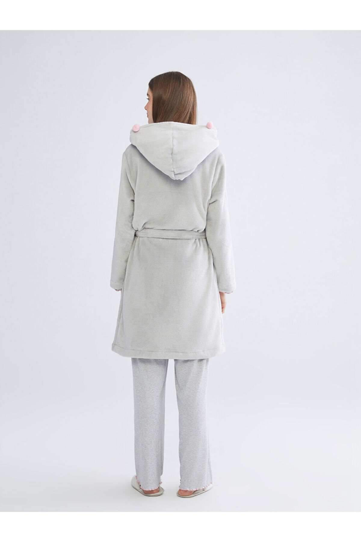 Gri Kapüşonlu Pelüş Kadın Sabahlık