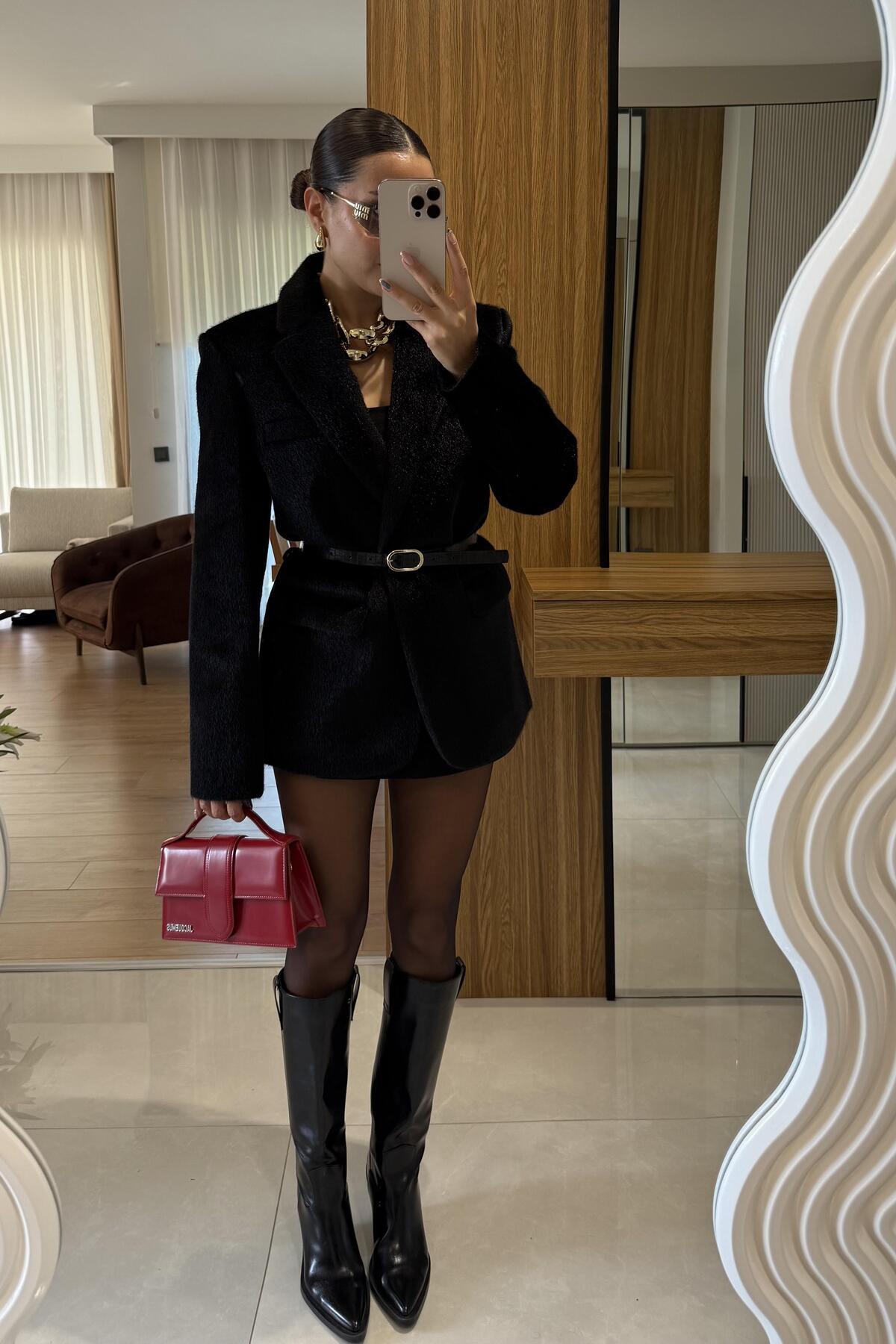 Aisha Siyah Dokulu Premium Kemerli Blazer
