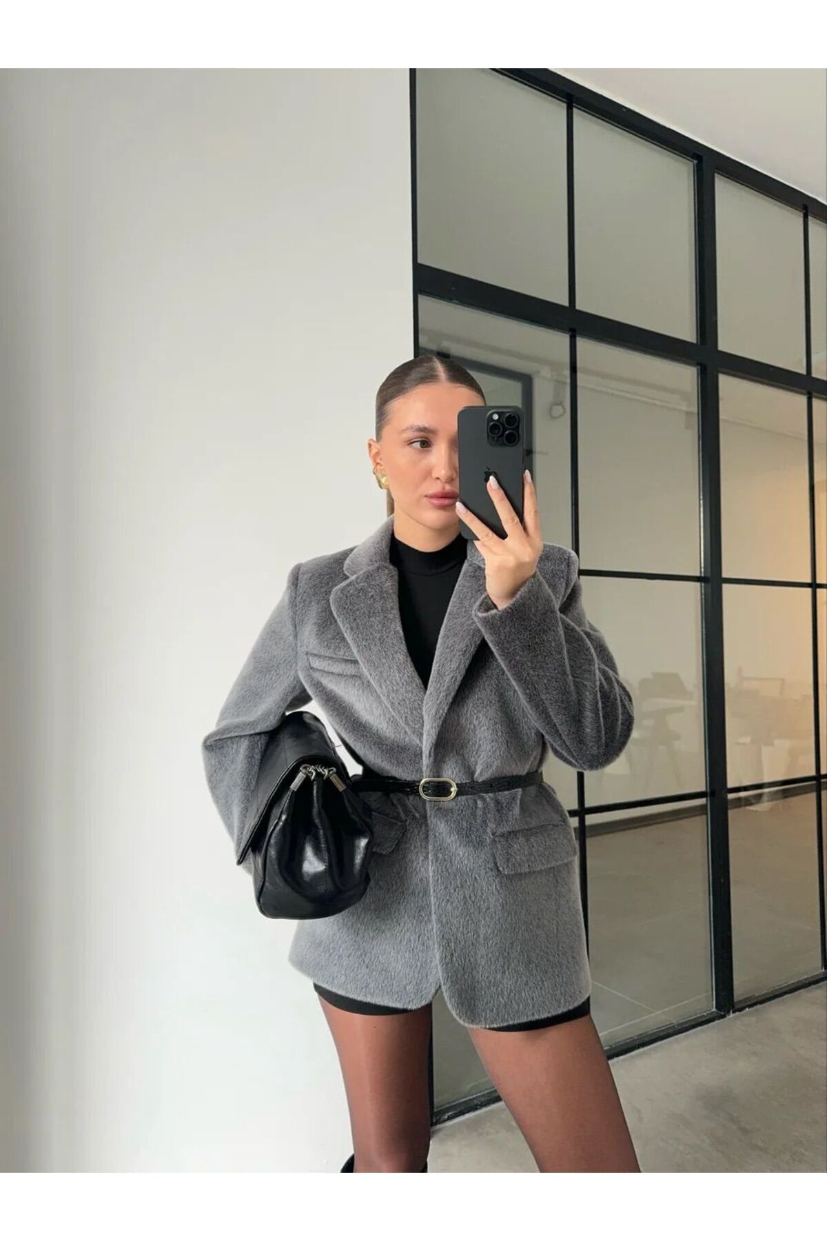 Siyah Astarlı Kemerli Peluş Tüylü Ceket