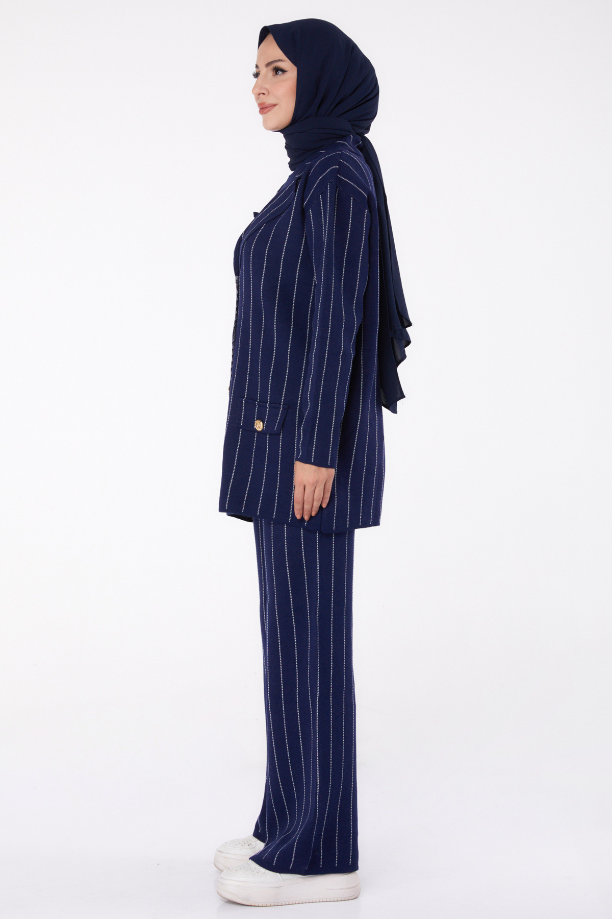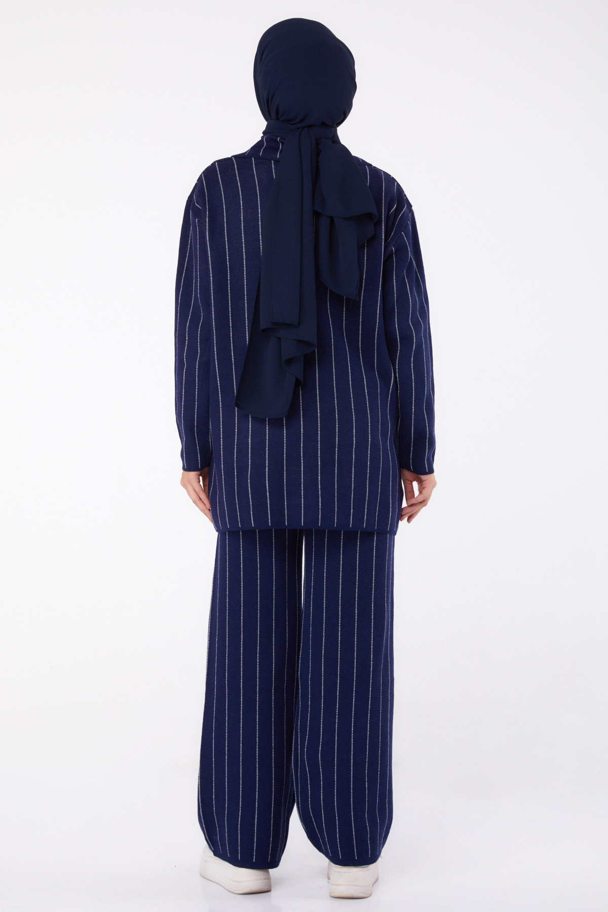 Düğmeli Çizgili Triko İkili Takım Lacivert - 27666