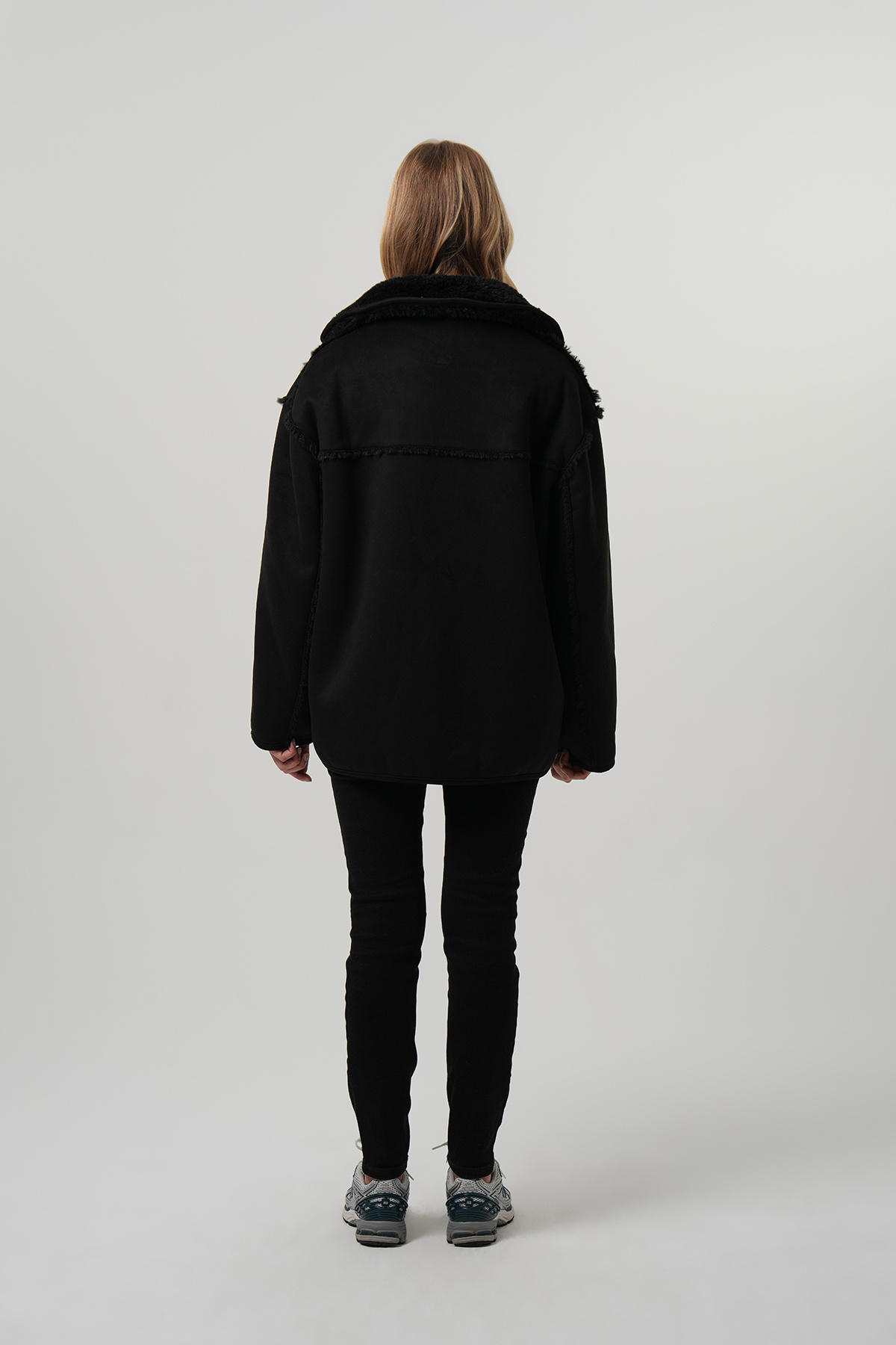 - Kış aylarında sıcak tutan peluş astarlı, siyah renkli kadın süet mont.