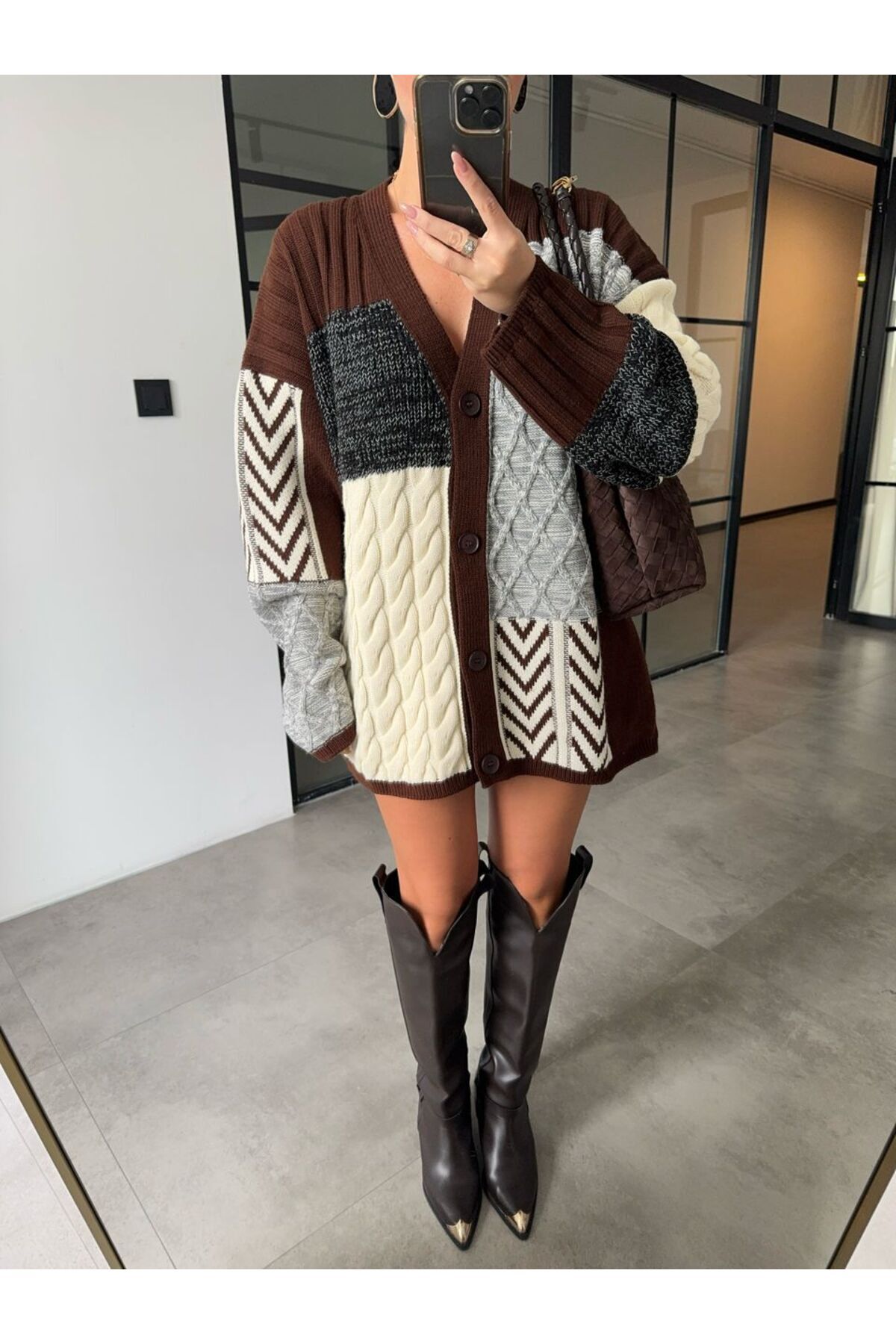 SAÇ ÖRGÜLÜ KAHVERENGİ OVERSİZE UZUN HIRKA