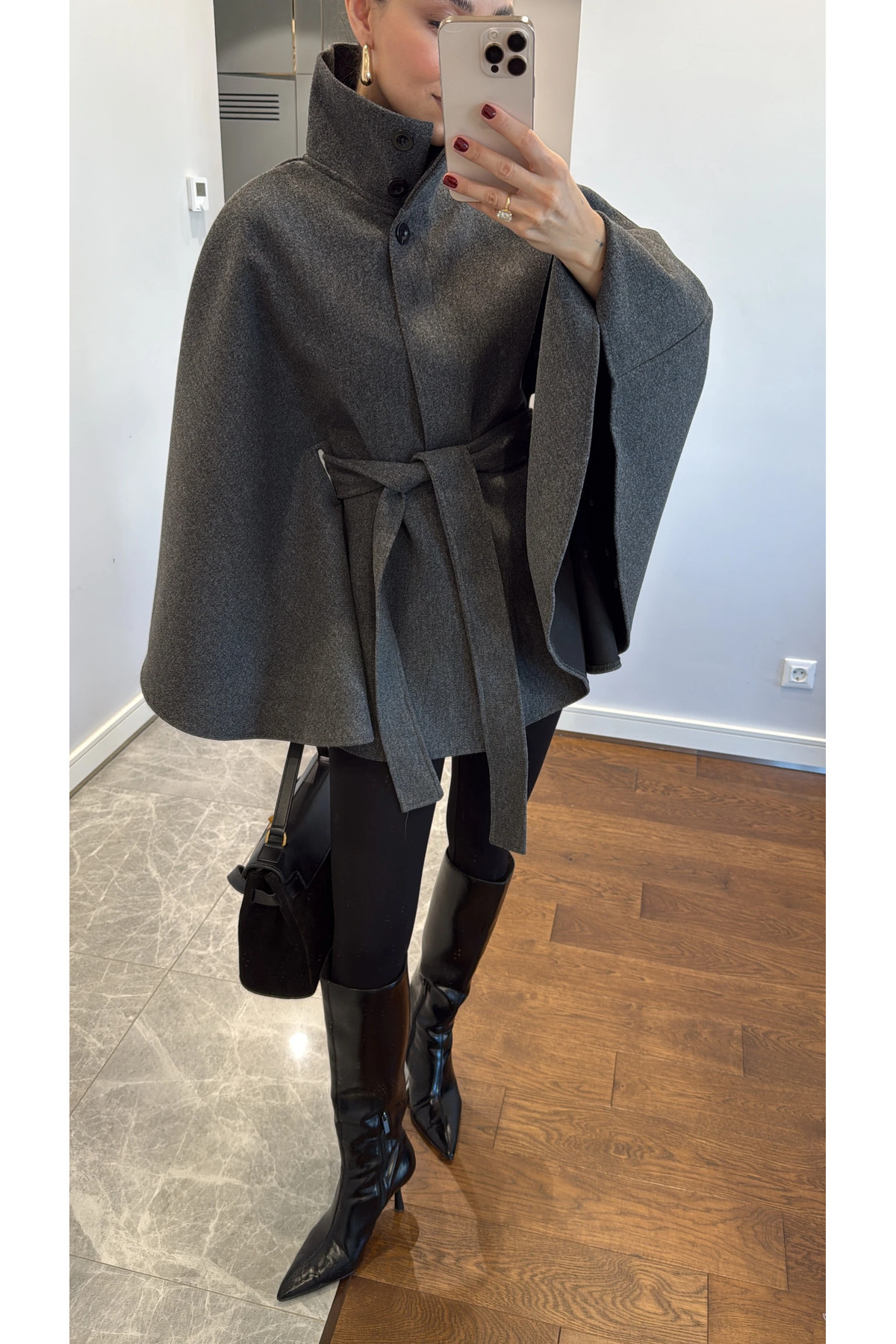 Modelin Ölçüleri:170 cm, 52 kgBel: 65 cmKalça: 92 cmGöğüs: 82 (75b)Omuz Genişliği: 93 cmBacak Boyu: 97 cmZamansız şıklığın en zarif hali olan bu panço, kaşe dokusu ve kemer detayıyla hem sıcak tutar hem de stilinize sofistike bir dokunuş katar.