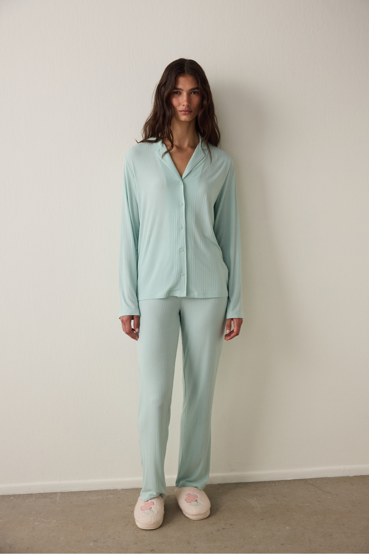 Greenish Rib Ls Gömlek Pantolon Set, takım olarak sunulan rahat bir pijama setidir.